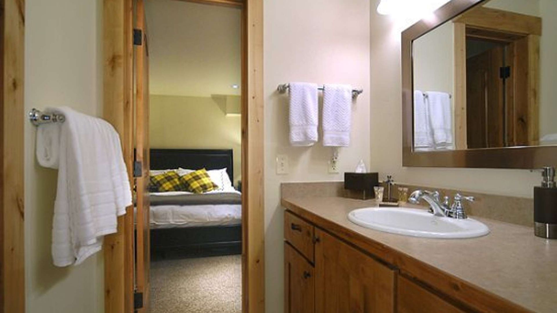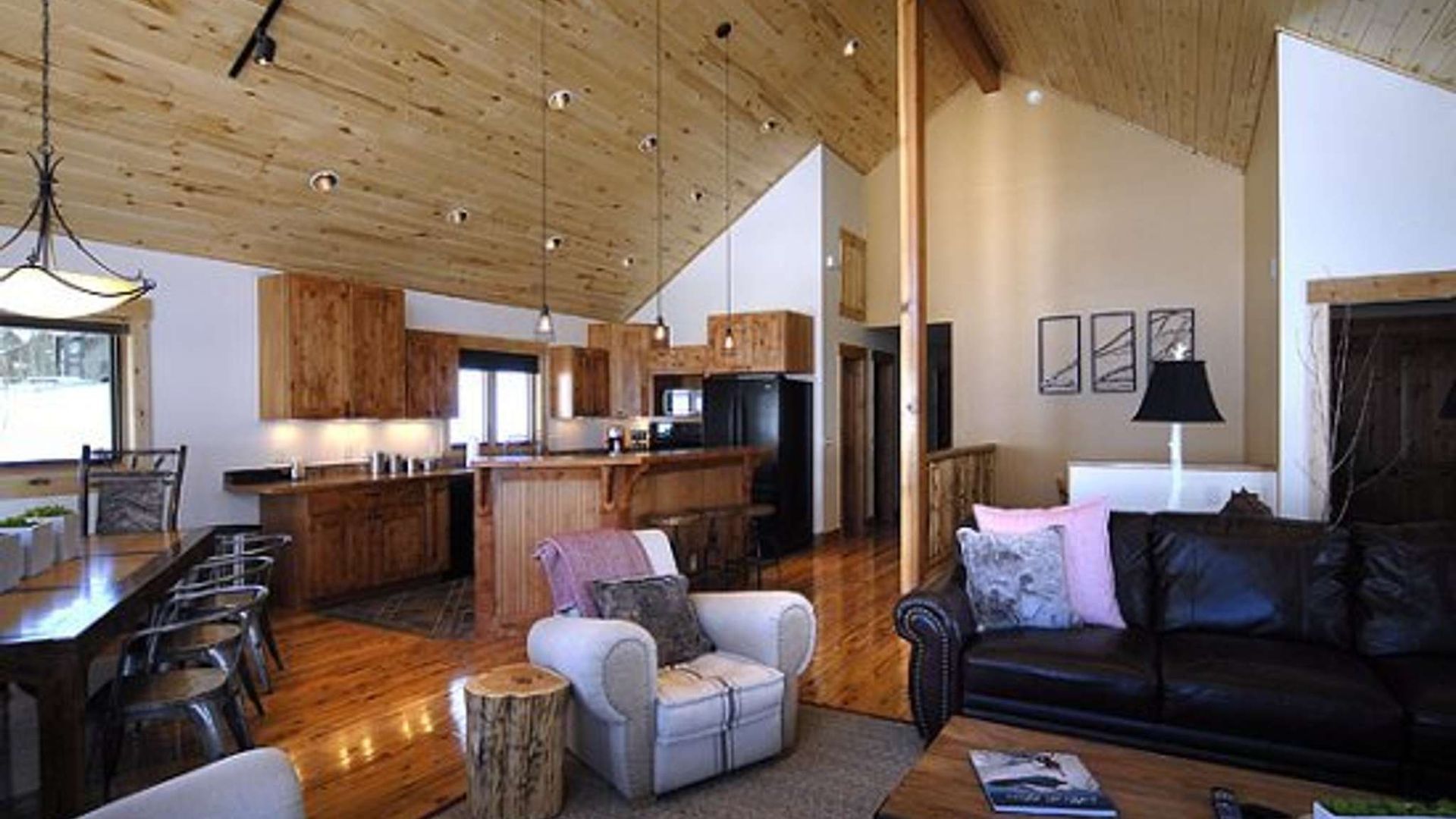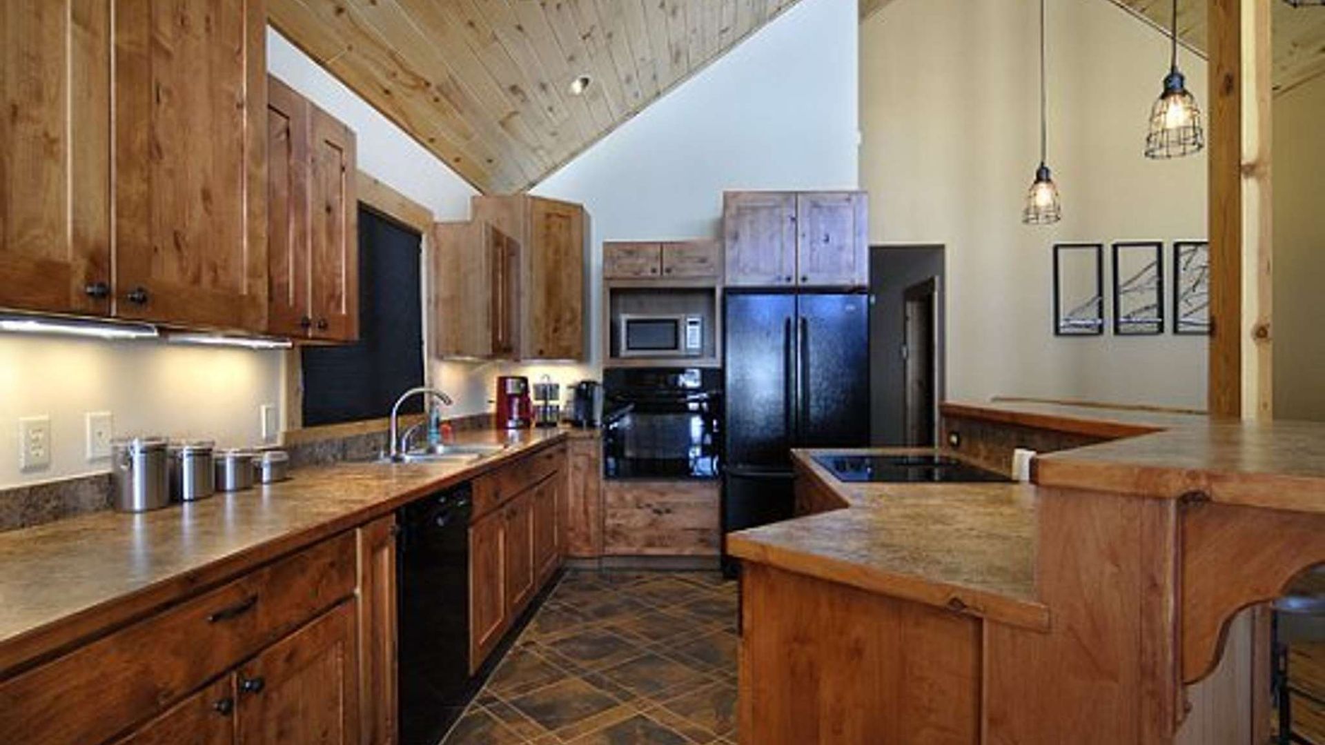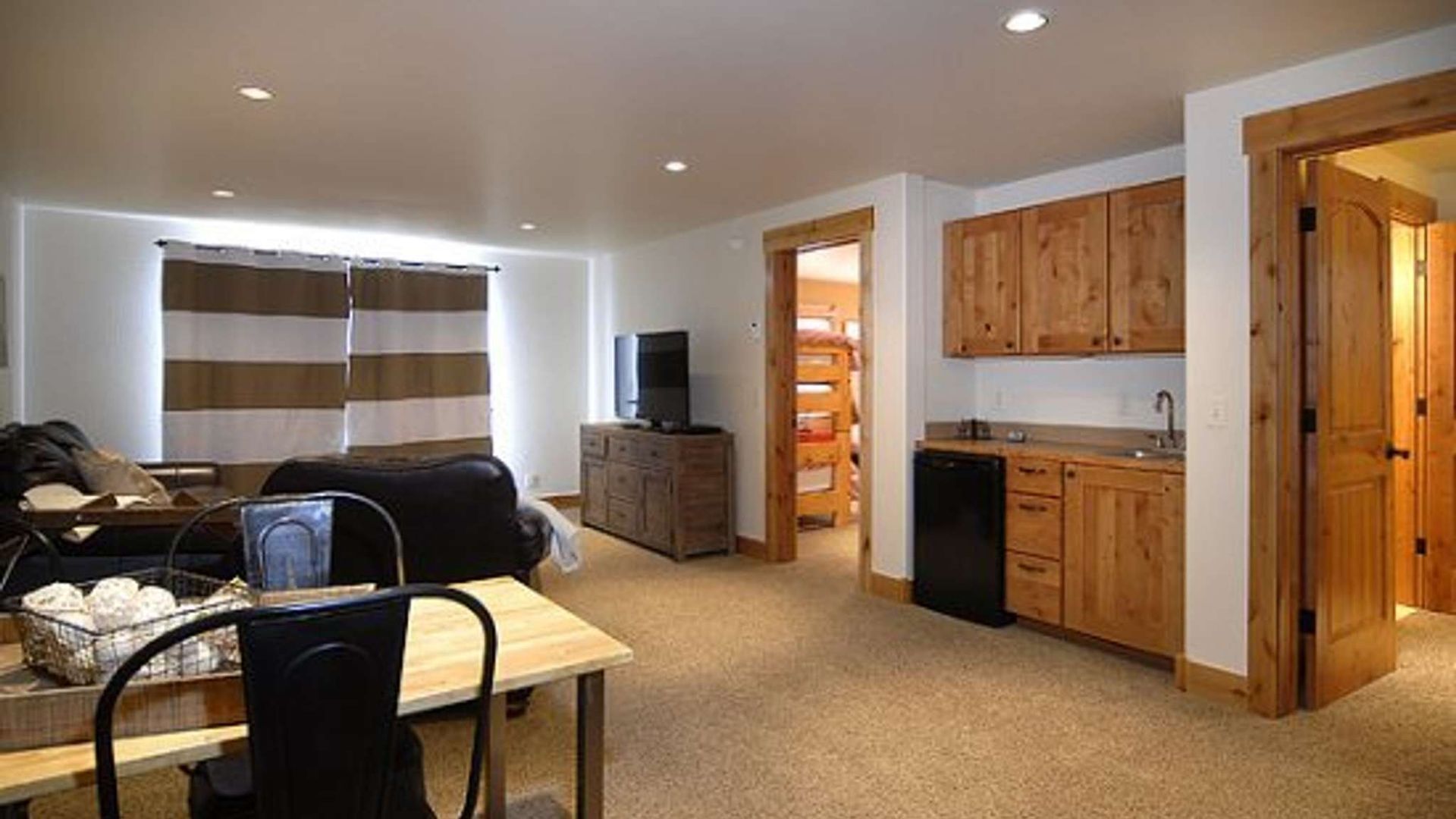 The Great Room features vaulted ceilings, Australian Cypress floors and an open floor plan which encompasses the newly renovated kitchen, dining and living areas. A large stone fireplace and 55' flat screen HDTV make this the perfect gathering place for your group. The downstairs living space boasts a 46' HDTV, table for puzzles and games, sleeper sofa, half bath and a wet bar that includes a sink and mini-fridge.